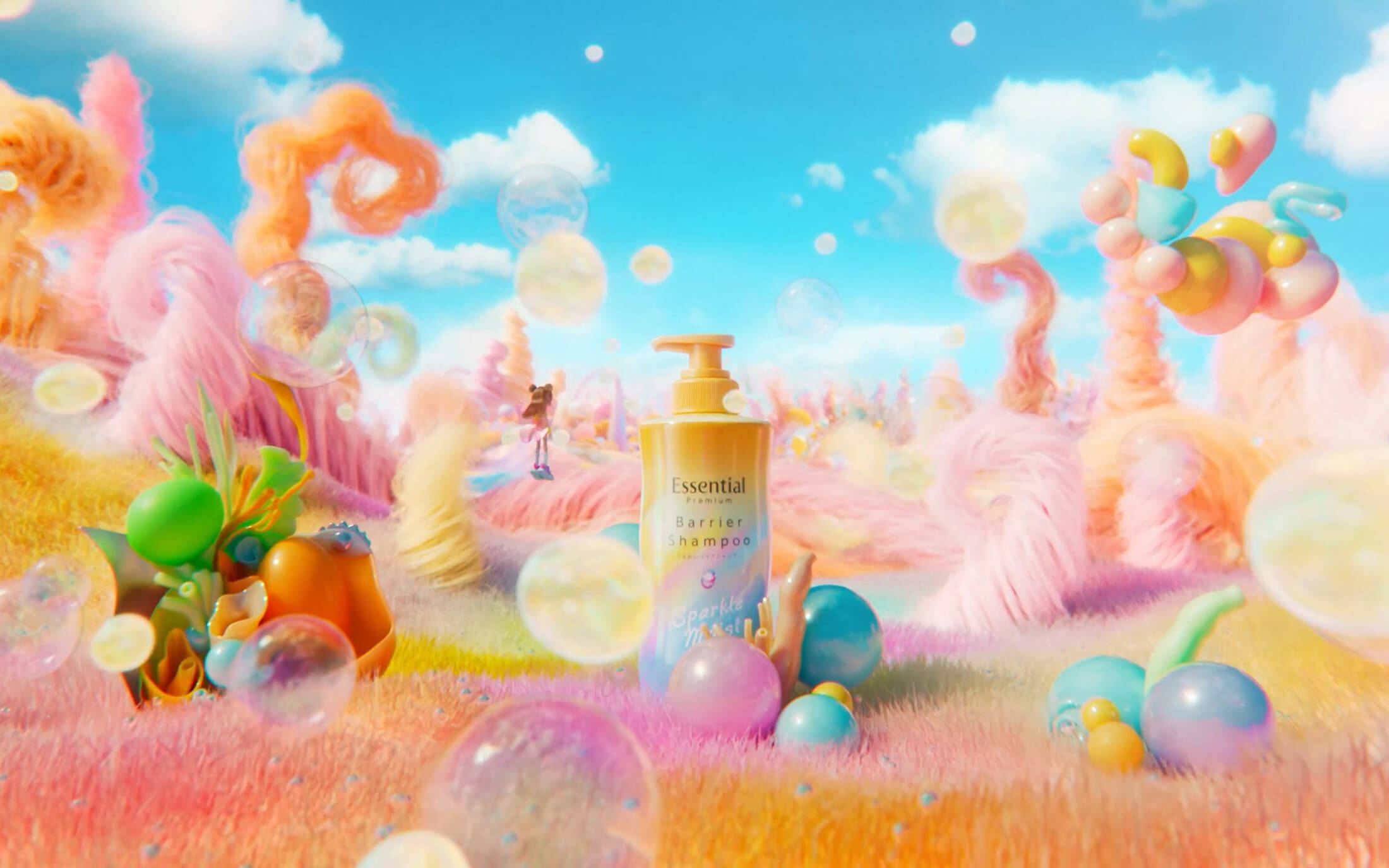 そこは“Essential”が生み出すHAPPYな異世界で、幻想的かつポップな空間に、とろとろとした黄色い玉が漂い、その玉が髪に触れることで、ダメージを受けた髪がなめらかにまとまり、美しい髪へと変化していきます。髪の変化とともに笑顔と自信を取り戻した彼女は、前向きな気持ちで再び現実の世界へと駆け出していきます。CGならではの表現とカラフルなビジュアルを通して、髪だけでなく気持ちまで明るく変化していく様子を描いたCMです。